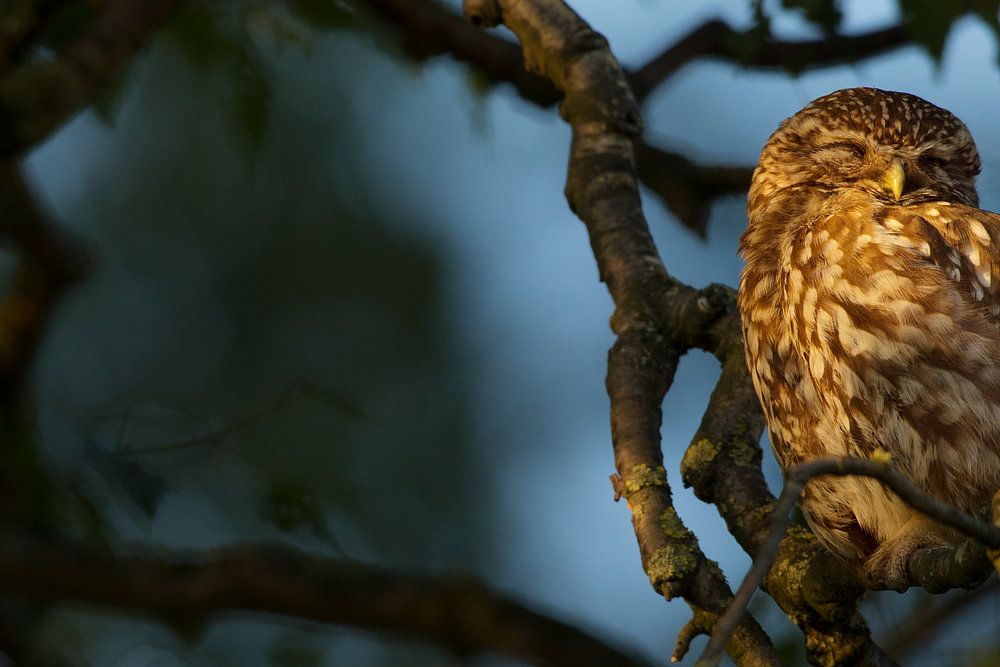 Little owl in the tree in the last evening light by Jeroen Stel