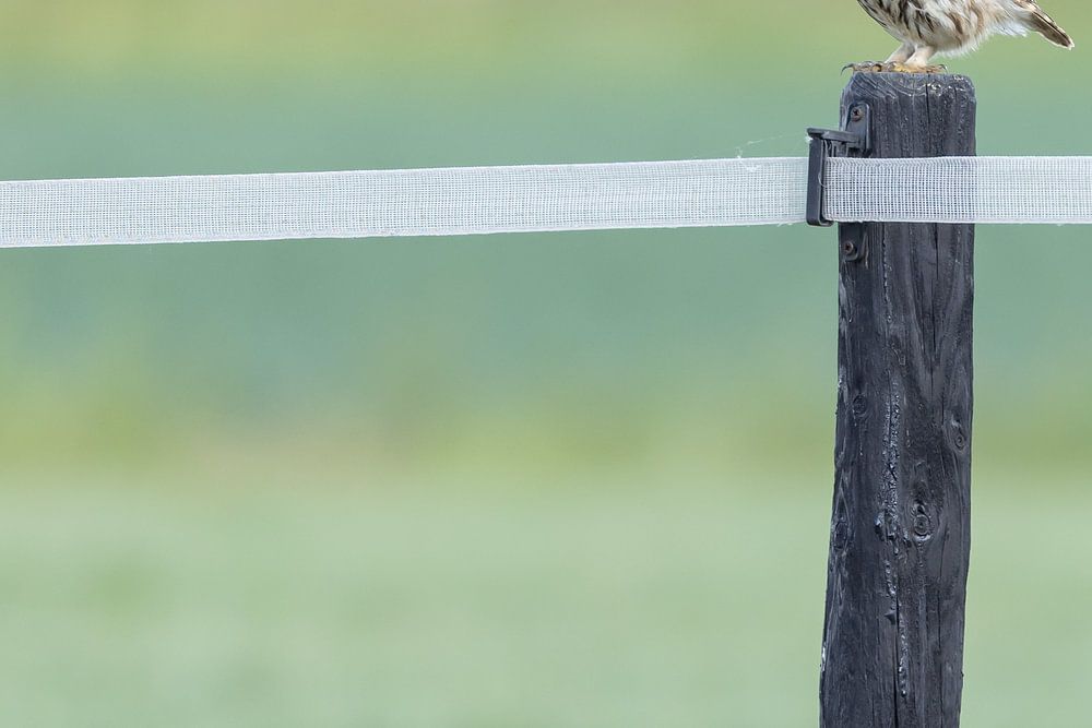 A little owl is sitting on a post near a meadow. The meadow behind it has different shades of green. It is my first encounter with a little owl. I enjoy the moment. The little owl looks straight into the lens with its large eyes. Its iris is yellow. Its feathers are brown with white speckles. Its legs are covered in light-coloured…