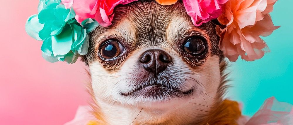 The cheerful image of a lovingly dressed Chihuahua lady adorned with colourful flowers unfolds in a radiant sea of soft pastel shades. Her charming charisma and the playful mix of colours bring a touch of joy and joie de vivre. This picture will be the perfect highlight for a living room where it will spread good humour.