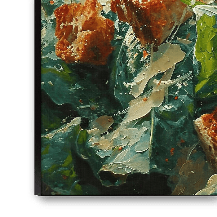 Living Salad Expression | Food Art Painting - This vibrant artwork depicts a classic Caesar salad with an explosion of tasty croutons and rich Parmesan cheese, served with artistic flair. The brush strokes are expressive and thick, making the texture of the green leaves and crunchy bread cubes almost tangible. The background has a deep, aquamarine hue that offers a fresh and dynamic contrast to the subject.