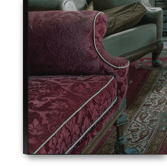 This is the living room of an abandoned farmhouse. Many pieces of furniture and details are still present, such as the typewriter, several paintings and a large mirror