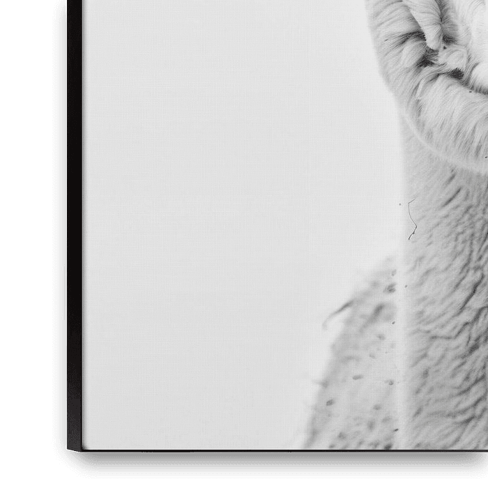 This black and white portrait of a llama captivates with its detailed depiction and the animal's charming expression. The clear contrasts and fine details of the fur give the image a timeless elegance. Perfect for lovers of animals and minimalist art, this artwork brings a calm and stylish touch to any living or working environment.