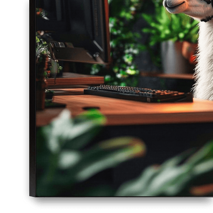Amidst lush plants and soft light, a llama sits with a headset that immerses it in a digital world. The screen radiates a warm glow while the animal gazes intently at the keyboard. A charming blend of nature and technology that playfully combines gaming and animal love.
