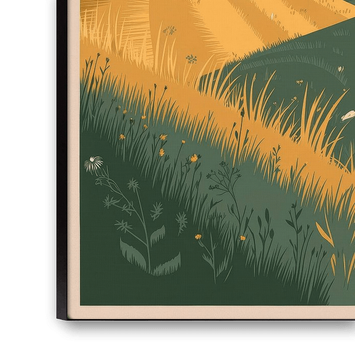 Rolling hills in warm earthy tones, criss-crossed by gentle waves and sprouting wildflowers, evoke a sense of freedom and closeness to nature. The radiant sunrise lends the scene an inviting atmosphere and makes this artwork the perfect addition to the living room, where it creates cosiness and a relaxed mood.