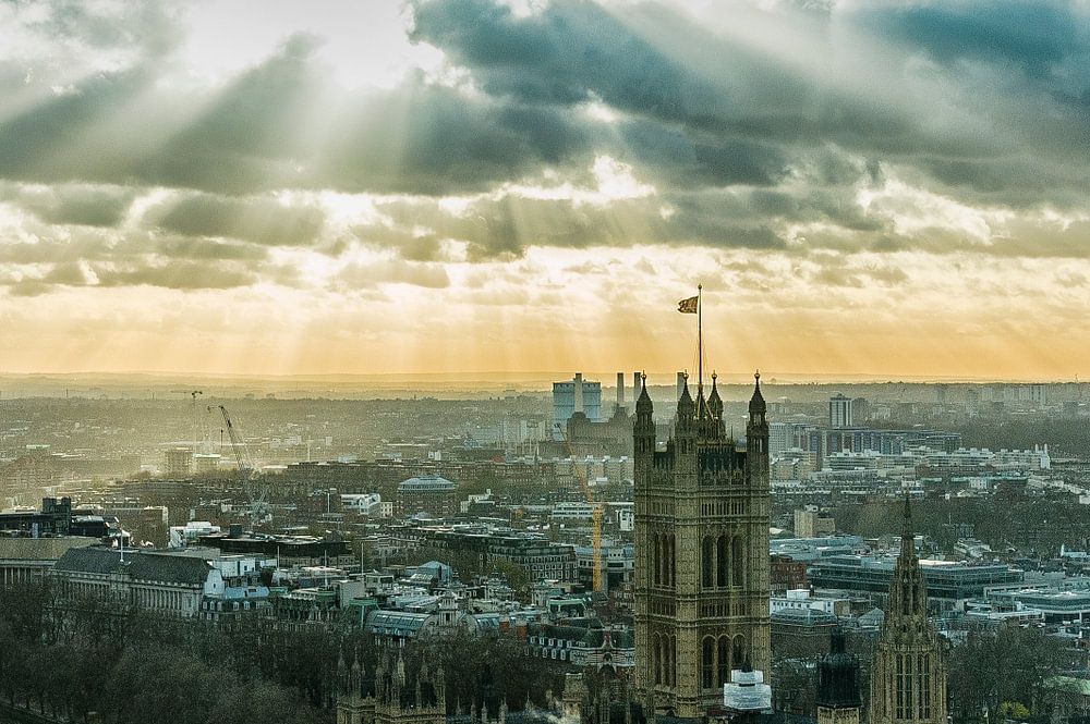 Foto gemaakt vanuit de Londen Eye. blik over de rivier de Theems en de parlementsgebouwen van Londen. Rechts is nog juist de Big Ben zichtbaar op de foto.