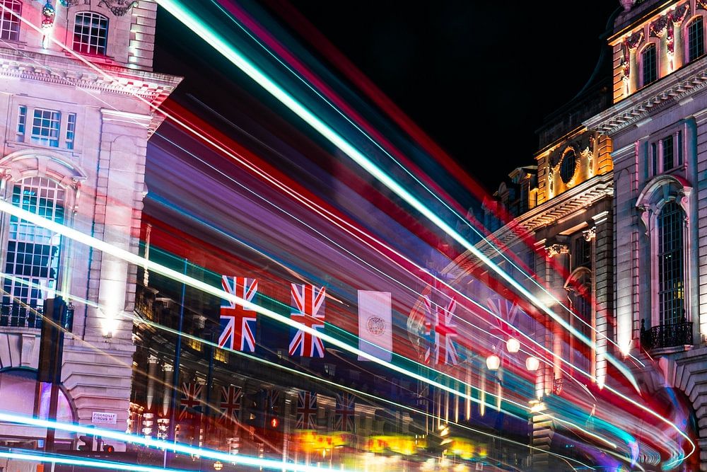 A long shutter speed photograph in a street in the middle of Piccadilly Circus, London. At long shutter speed, the English city's iconic red bus gave a beautiful shot of lights, colours and light.