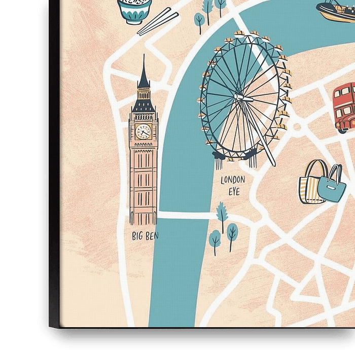 City map of London, with illustrations of famous icons such as Big Ben, St Paul's Cathedral, underground, telephone box, London Eye and the River Thames