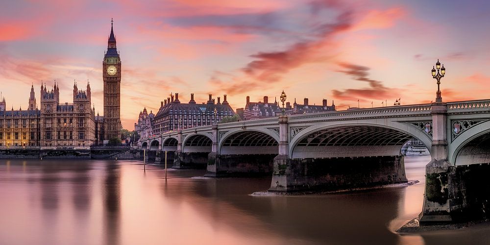 Fulminant sunset at the Westminster Bridge in the center of London in England / Great Britain. Opposite you can see the Palace of Westminster and the Big Ben, one of the landmarks of London. The bridge leads over the Thames, which wonderfully reflected the colors of the sky this evening.