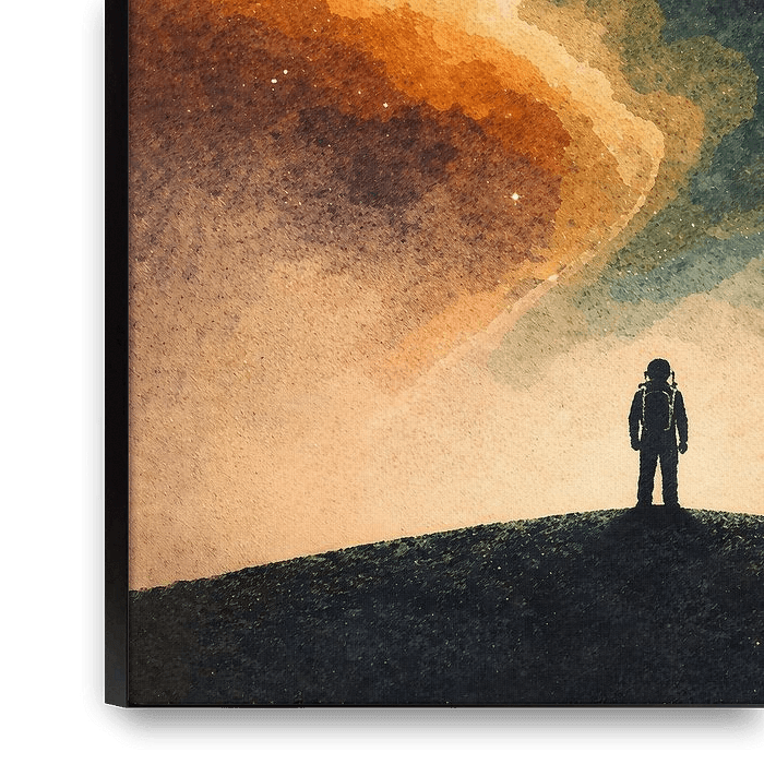 Buy this abstract artwork Lone Astronaut Under Watercolor Cosmic Sky by uwidya on canvas, ArtFrame, poster and wallpaper, printed on demand in high quality.