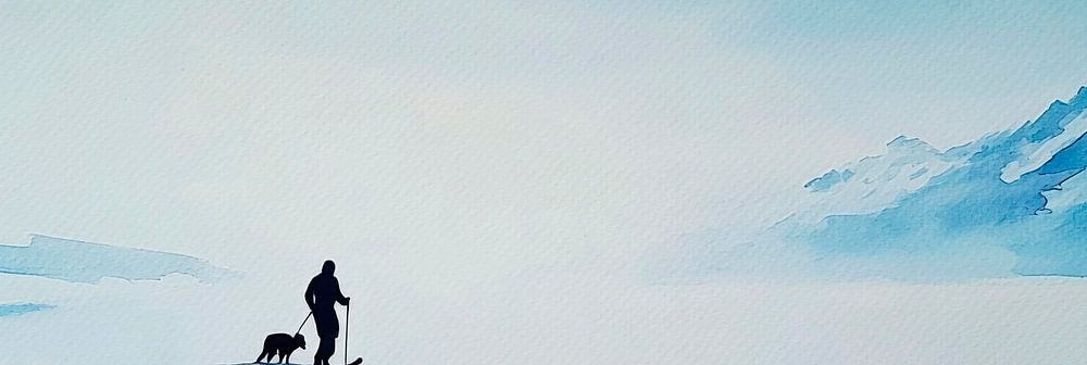 The picture shows a majestic winter landscape in which a lonely person with a dog wanders through endless white expanses. The soft blue tones of the sky and the snow-covered mountains create a melancholic but peaceful atmosphere, while the silhouettes of the figures represent a touching connection to nature.