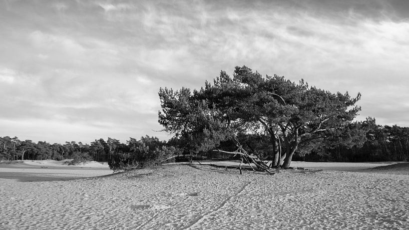 Buy this landscape artwork Lonely Tree on a Sandy Plain: Timeless Beauty in Black and White by Hevonax Photography on canvas, ArtFrame, poster and wallpaper, printed on demand in high quality.