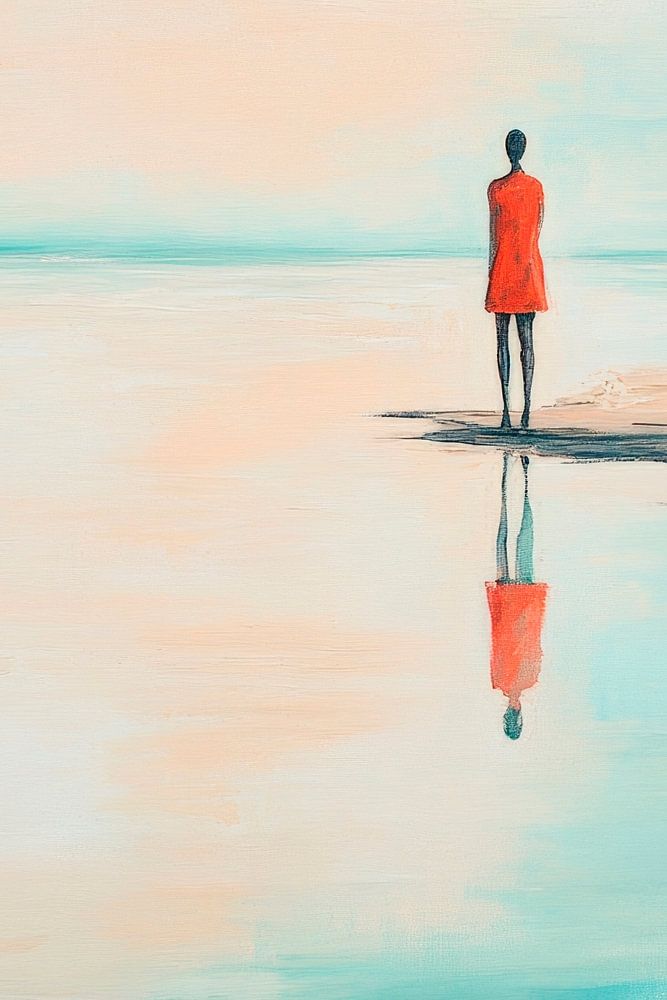 Soft colours and a picturesque mood capture the moment of stillness. A figurative presence in bright red stands on the shore, gazing at the calm surface of the water reflecting the sky. This artful painting brings a sense of peace and thoughtfulness to any living room, creating an inviting, relaxing atmosphere.