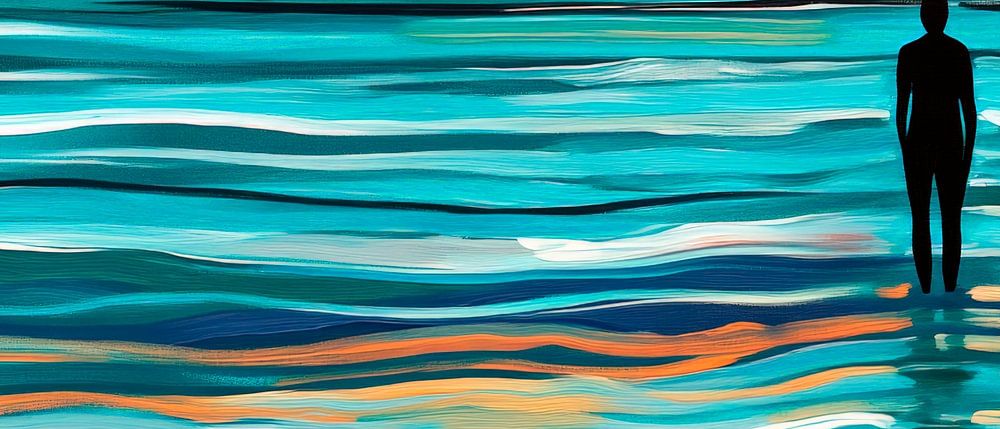 A mystical moment by the water, captured in vivid shades of blue and turquoise, radiates peace and relaxation. The shimmering waves reflect the soft light of the sunset and create a meditative atmosphere. Perfect for the bedroom or a retreat to promote inner peace and inspiration.