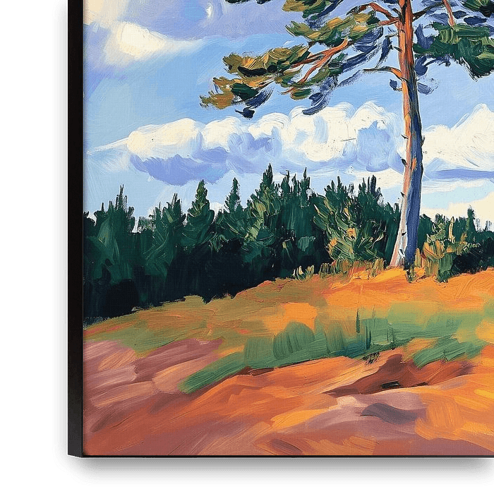 This artwork depicts a single pine tree standing on a small hill, set against a wide sky with large, soft clouds. The bold brushstrokes and vibrant colours of blue, green and warm earth tones give the landscape a lively yet tranquil atmosphere. The scene evokes open nature, freedom and tranquillity, bringing a fresh, natural mood to any…