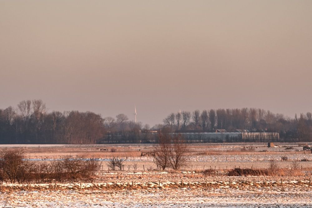 Lonely runner in the early morning in the snow along the canal through Walcheren