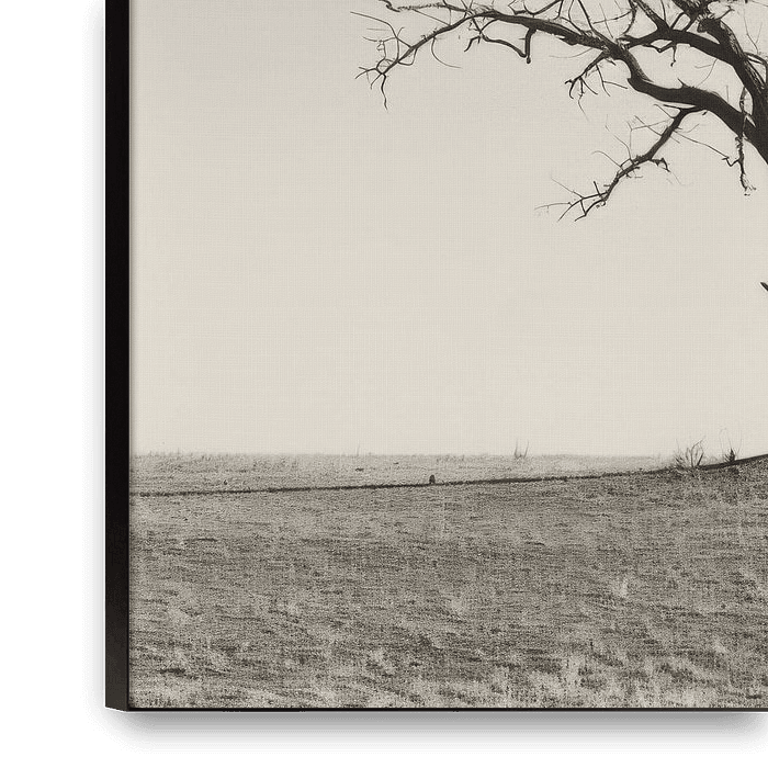This impressive work of art shows a solitary tree standing majestically in the vastness of the prairie. The clean lines of the barren tree stand out in contrast against the endless blue sky, conveying a sense of calm and serenity. The artist has masterfully managed to capture the quiet beauty of nature, while at the same time the…