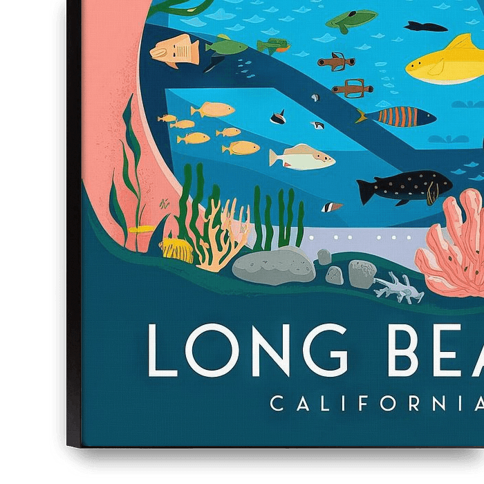 Dive into the colourful underwater world of Long Beach, California. Vibrant fish swim through a stylised scene surrounded by soft corals. This harmonious depiction brings a sense of calm and relaxation, ideal for the living room or a maritime decorating project. Let the ocean come alive in your room!