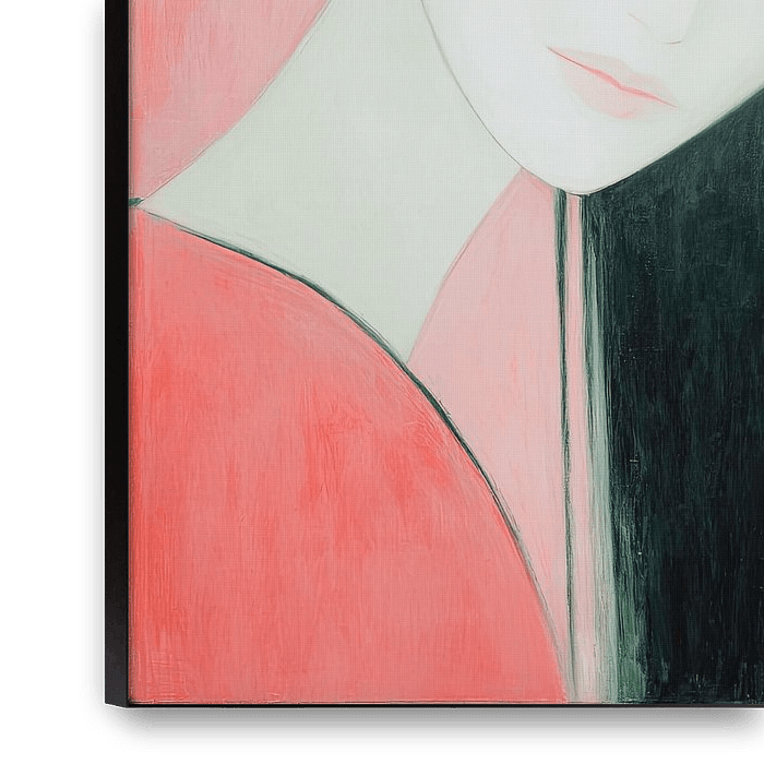 Verder valt de zachte roze achtergrond en de koraalkleurige kleding op, die het gezicht omlijsten zonder te domineren. De nek is lang en elegant uitgewerkt, de halslijn snijdt als een grafische boog in het vlak. De combinatie van matte en subtiel glanzende lagen maakt dat het licht op het doek lijkt te ademen; sommige randen zijn uitgeveegd, alsof het beeld net zichtbaar wordt of juist aan het vervagen is. Dit portret schilderij ademt herinnering — je ziet fresco-achtige trekken gecombineerd met moderne helderheid — en dat is precies waarom de kunstenaar voordezetweesterkeelementenkoos:debleke,bijnasacralehuidendedonkerehaarstroomvormensameneenverhaalvanaanwezigheidenverdwijnendzijn,zachtenscherptegelijk.