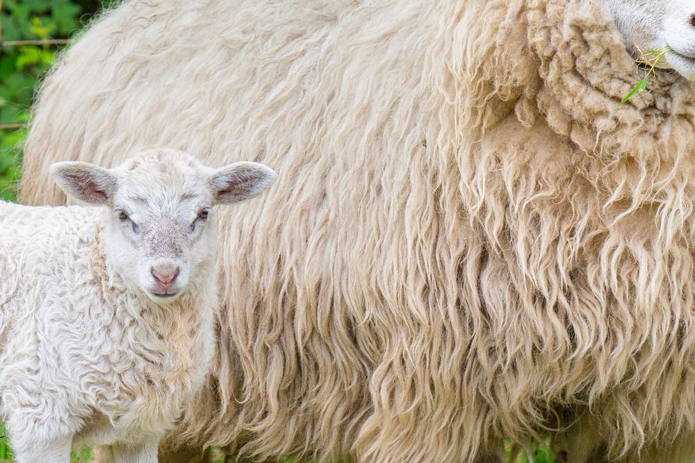 Long-haired sheep and newborn lamb are standing together in the green pasture. I made this photo in the Netherlands in the spring. Many farm animals get young during this period.