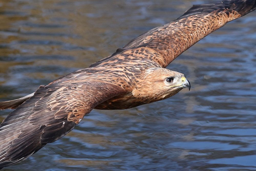 A Long-legged Buzzard in flight over water.. The Long-legged Buzzard is a large species of buzzard that occurs in dry steppe areas in southeastern Europe, northern Africa and western Asia. The Long-legged Buzzard searches for its prey in flight, from a perch or from the ground. This bird of prey mainly eats small mammals, reptiles and large insects; sometimes small to medium-sized birds.