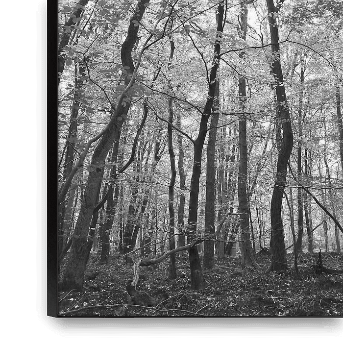 Quiet black and white shot of narrow trees in the woods near Gortel on the Veluwe.