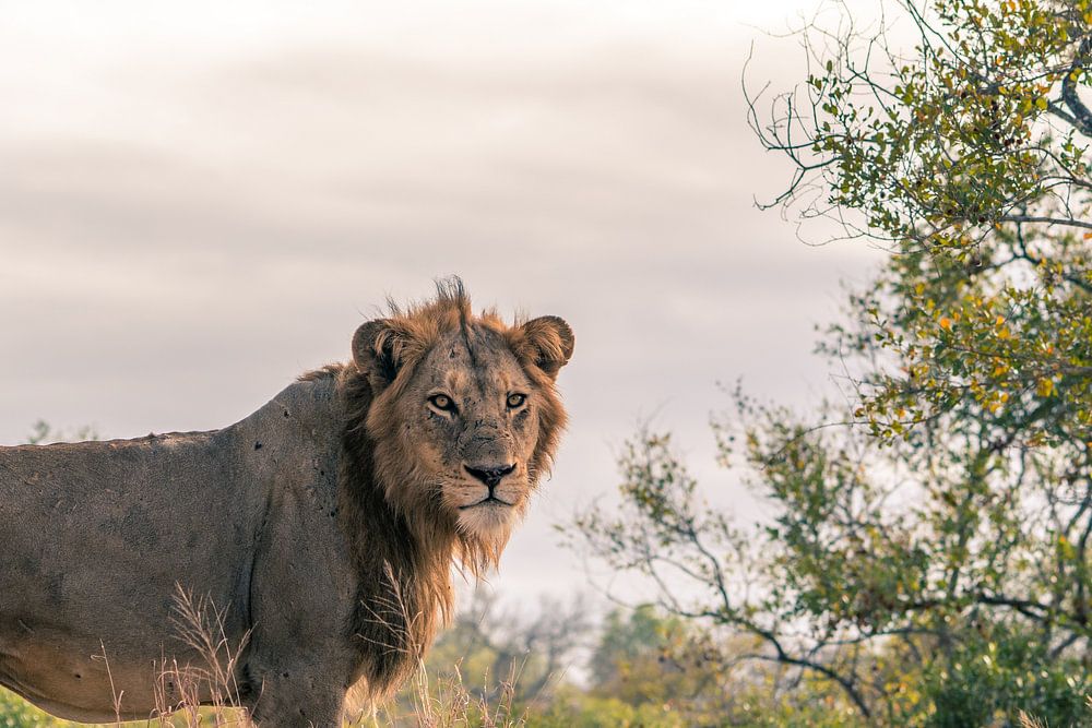A standing lion looking around in the Kruger Park in South Africa. The king of the animal kingdom who is looking for prey in the savannah.