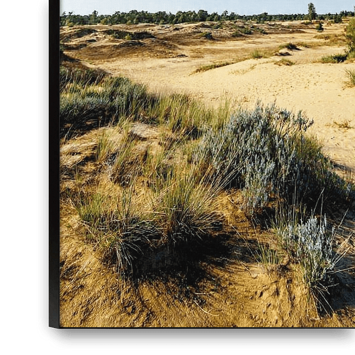 This artwork depicts the serene dune landscape of the Loonse en Drunense Duinen in North Brabant, where sand, grass and low shrubs combine to form a natural and soothing whole. The gentle slopes of the sand are interspersed with patches of green and small shrubs that stand bravely in the open terrain. On the horizon, a row of trees…