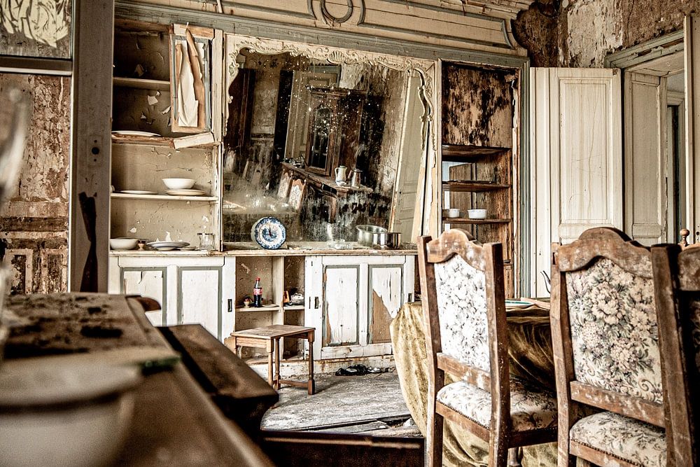 This house was abandoned a long time ago The last residents left the table set. On the table was a photo, a picture of how the chateau used to look, and how beautiful the garden was. There is no more of that now. Mold and greenery are taking over the little chateau, taking it back into nature.
