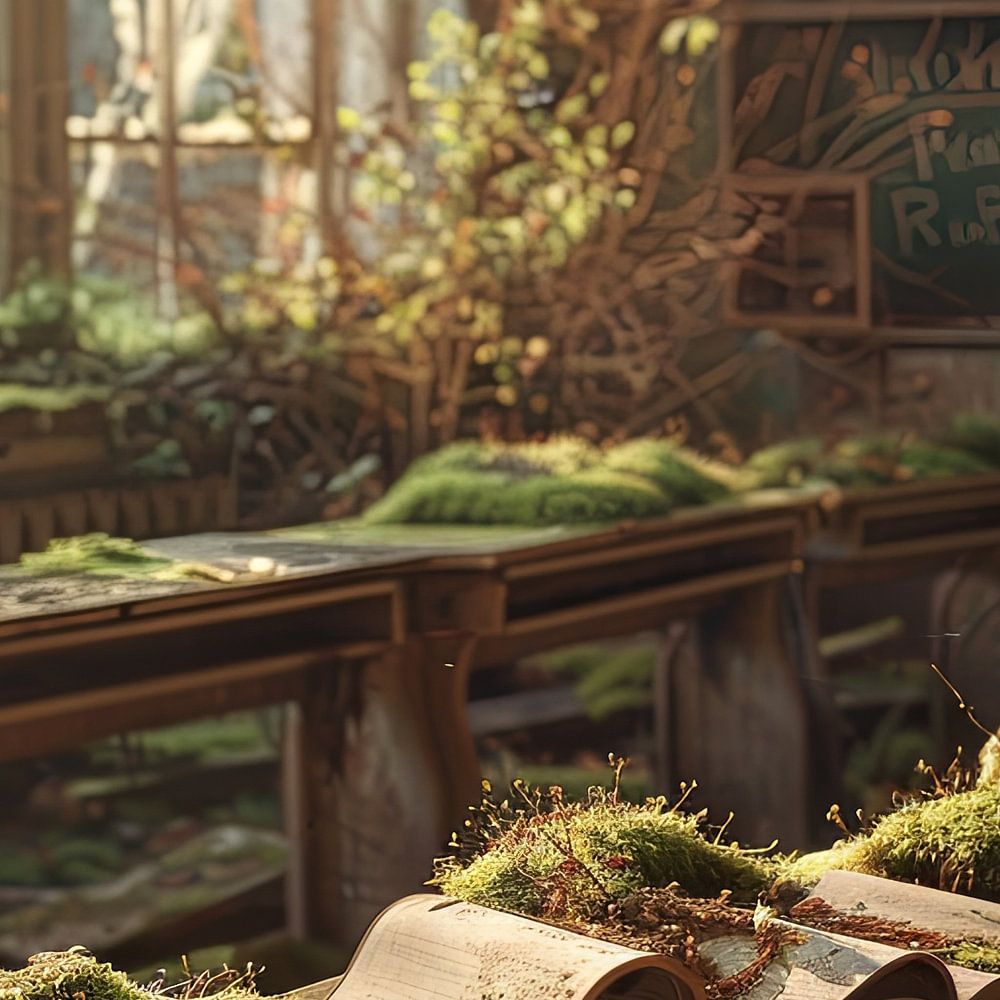In "Green Lessons", we discover an abandoned school environment that is gently reclaimed by nature. The scene is flooded with a soft, green light that filters through large windows and transforms the classroom into a living world. Young shoots and plants cover the school desks, evoking an atmosphere of hope and renewal. An open book on one of the desks perhaps symbolises forgotten knowledge or the perpetual cycle of learning and growing. This image particularly appeals to nature lovers, environmentalists and fans of abandoned places who find deeper meaning in the connection between man and nature.