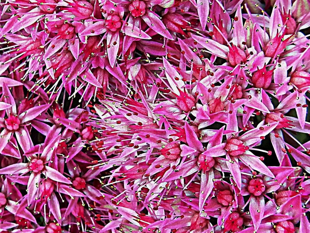A close up of the pink flowers on a flowering shrub. Lost In Pink Masses shows several shades of pink and patterns evidenced by these pretty blossoms.