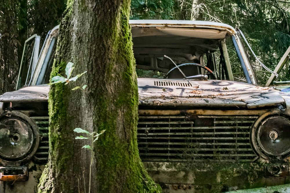 Vieille voiture abandonnée dans un bois avec un arbre qui pousse entre le pare-choc et la carosserie