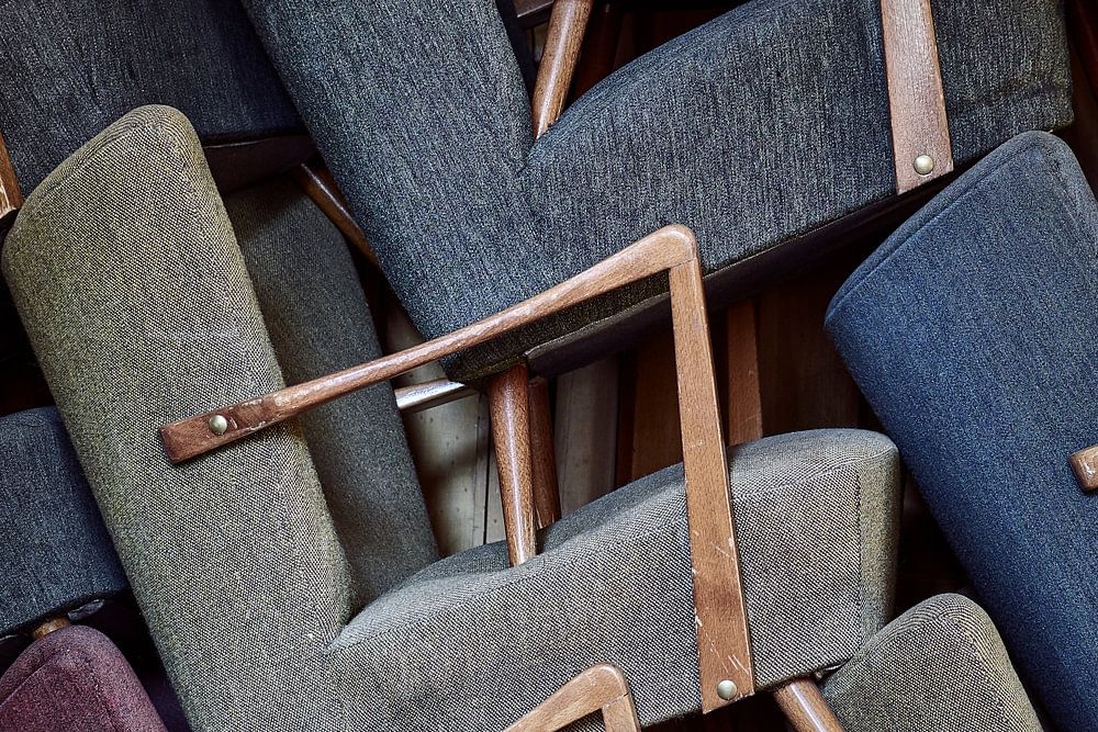 Colored upholstered chairs stacked on top of each other in a Lost Place.