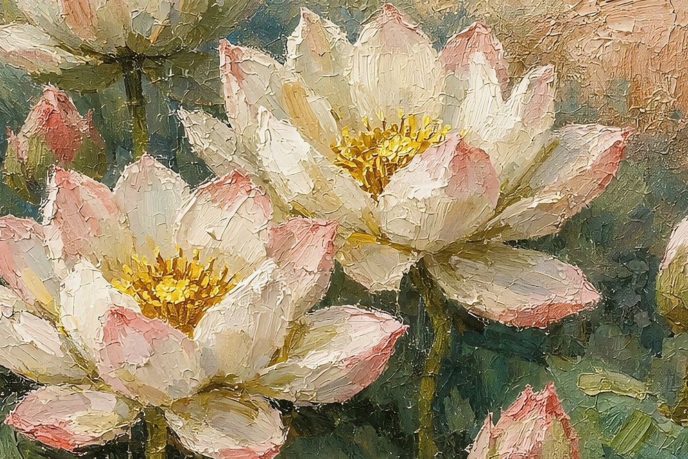 A dreamy, impressionistic oil painting that captures the serene beauty of blooming lotus flowers on a tranquil pond. The artist has used thick, expressive brushstrokes (impasto) to give texture and depth to the soft pink and white petals. The warm, golden light in the top right corner suggests an early morning sun dispelling the mist…
