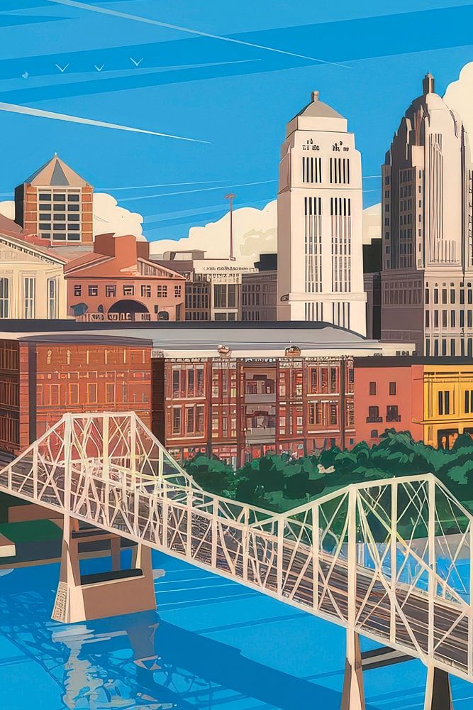 A vibrant scene that perfectly captures the charm of Louisville! The impressive skyscrapers are reflected in the glistening water, while the iconic bridge creates a link between past and present. This artful depiction brings a cheerful touch to any living room and encourages daydreaming and conversations about travelling.