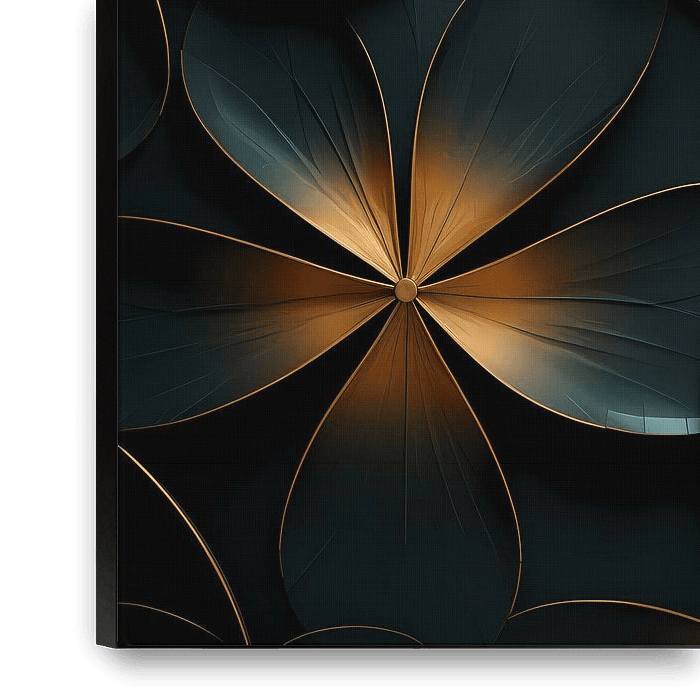 A play of dark turquoise and sparkling gold, where abstract flowers merge in a relaxed lounge vibe.