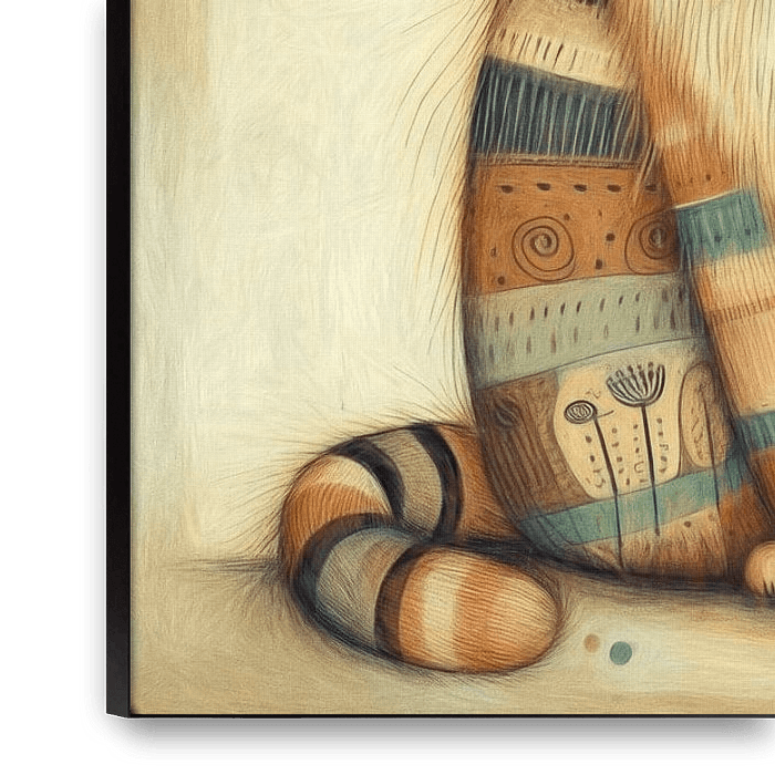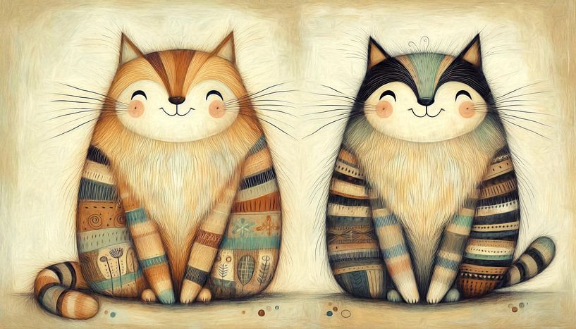 The picture depicts two playful cats with brightly patterned coats and cheerful expressions. Their symmetrical poses and the intricate detailing lend the picture a cheerful touch.