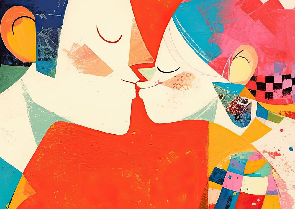 Love Art | Hearts and Hues Collide - This colourful pop-art painting shows two people in a loving kiss, surrounded by a vibrant jumble of abstract shapes, patterns and heart motifs in a multitude of bright colours.