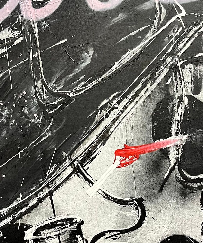 The painting "Love" shows a powerful woman with a tough edge, executed in shades of black and white. Her expression radiates self-assurance and a touch of mystery, while delicate black hearts subtly shimmer through the background, like hidden emotions. The title "Love" is applied to the image in graceful pink letters, which contrasts with the woman's rugged appearance and adds a touch of softness and femininity to the whole. The combination of the tough woman and the subtle, romantic elements creates an intriguing balance between strength and vulnerability.