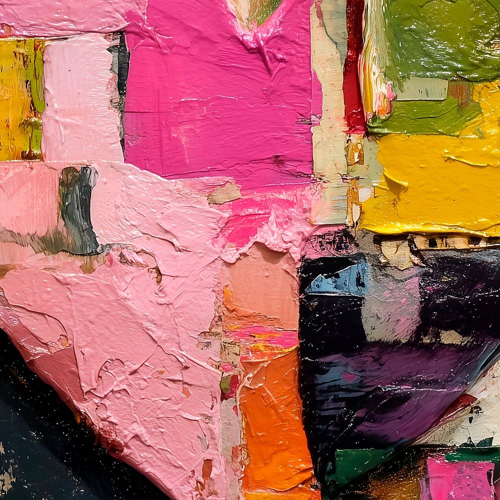An abstract artwork of a large heart shape in vibrant hues, surrounded by different geometric areas of colour. The background consists of layers of paint with a mix of rough and smooth textures, giving depth to the composition. A small, faint text label can be seen at the bottom, adding a subtle detail to the work.