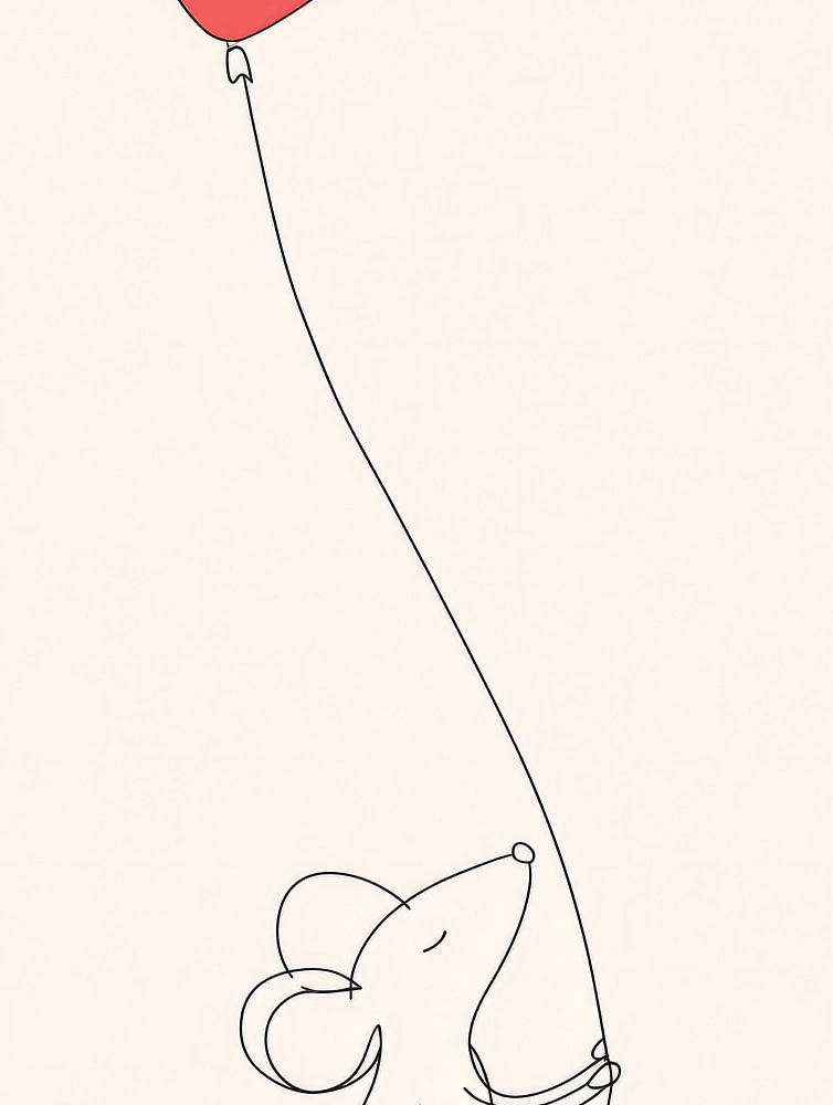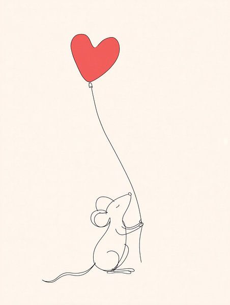 This minimalist illustration perfectly combines simplicity and charm. Against a warm beige background, black lines depict a mouse holding a floating balloon. The balloon, rendered in a striking red colour and shaped like a heart, forms a subtle yet powerful contrast with the calm background.