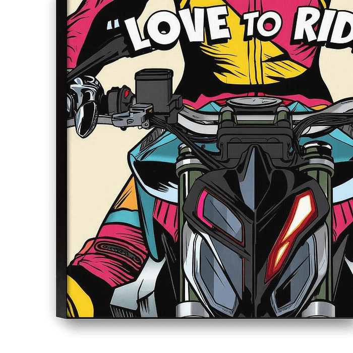 Tough, powerful and confident - this pop-art illustration shows a female motorcyclist heading straight for you. Dressed in a striking suit, with "LOVE TO RIDE" on her chest and dynamic elements like "FROOM!" and "RIDE!" around her, this artwork exudes pure determination. The strong lines, bright colours and comic style powerfully convey the feeling of speed and freedom. This piece is an ode to all women who love motorbikes, adventure and a good dose of guts. Perfect as a statement piece in a modern interior, hobby room or studio. Show that you ride with passion!