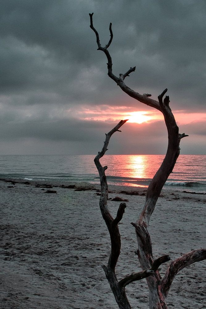 Sunset on the beach of the Baltic Sea at sunset. Love tree, tree in the sand on the west beach