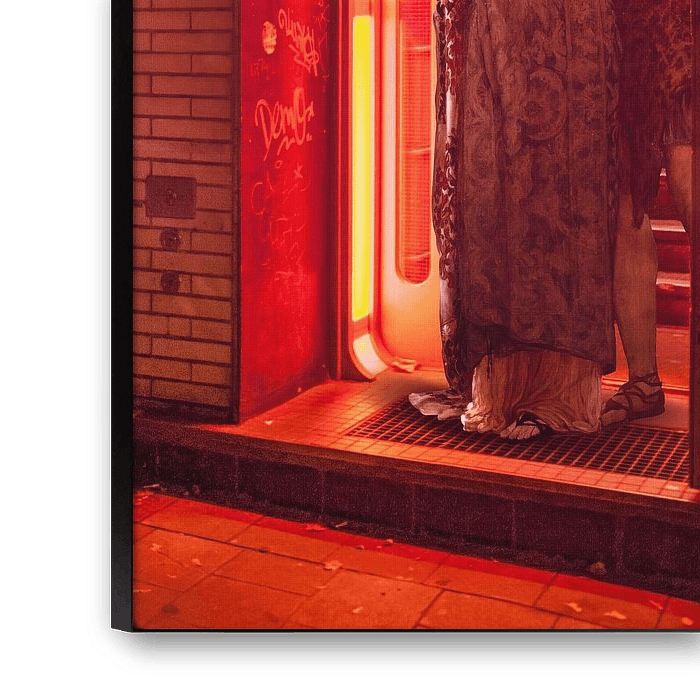 "Lovers Club" is a captivating collage that transforms the context of iconic classical paintings, bringing them into an urban and nocturnal environment. In this piece, a couple in a passionate pose emerges from a nightclub in an unspecified urban setting. Classical painting techniques intertwine with modern elements, creating a fascinating fusion of the ancient and the contemporary.