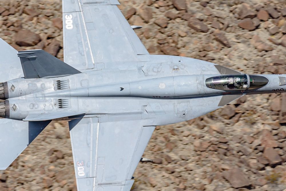 Low-flying U.S. Navy Boeing F/A-18E Super Hornet. Rainbow Canyon was one of the unique places in the world where photographers could photograph military aircraft flying through the valley from above. Military training flights had been flown here since World War II. After a crash in this canyon, the USAF, USN and USM stopped flying through this valley. Another very famous low-flying area for military aircraft is the Mach Loop in Wales. This photo was taken on 13 November 2017.
