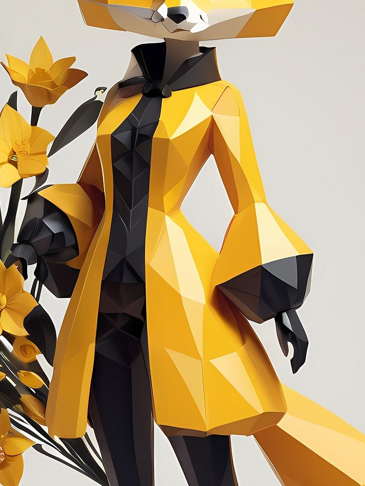 About "Low poly floral fox girl, black and yellow"