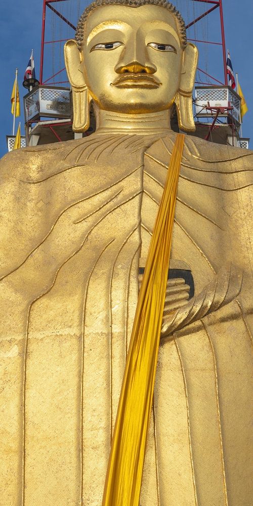 He stands majestically - still and full of grace: the 32 metre high standing Buddha of Wat Intharawihan, Luang Pho To, clad in shining gold leaf and decorated with glittering glass mosaics. Like a silent guardian, he towers into the Bangkok sky, his gaze gentle yet all-knowing, his right hand firmly clasped around the alms bowl - symbolising compassion and generosity.