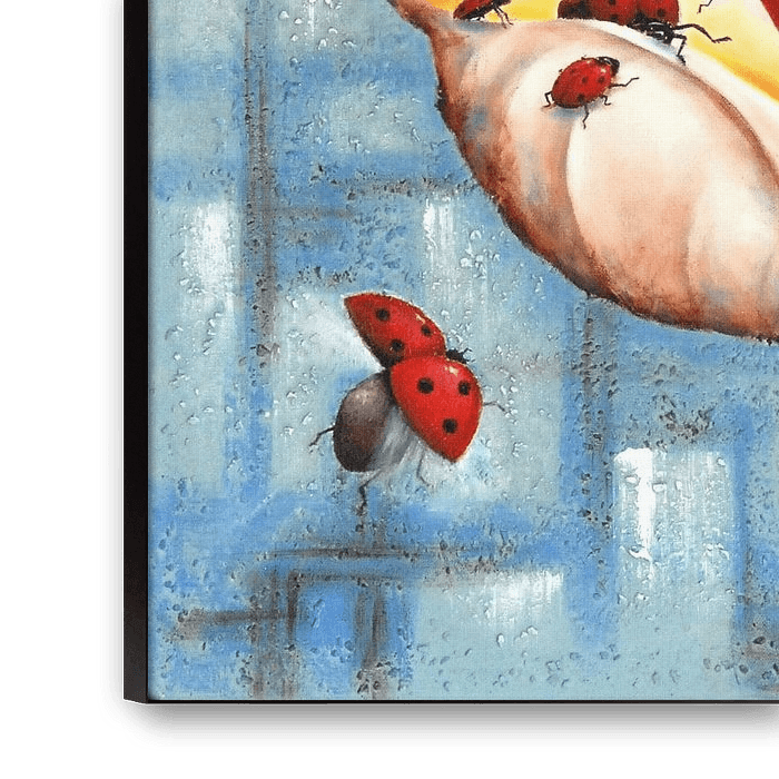 The painting is done in a mixed technique. This surreal story is about ladybirds that turn into cubes. Can they bring good luck in this form?