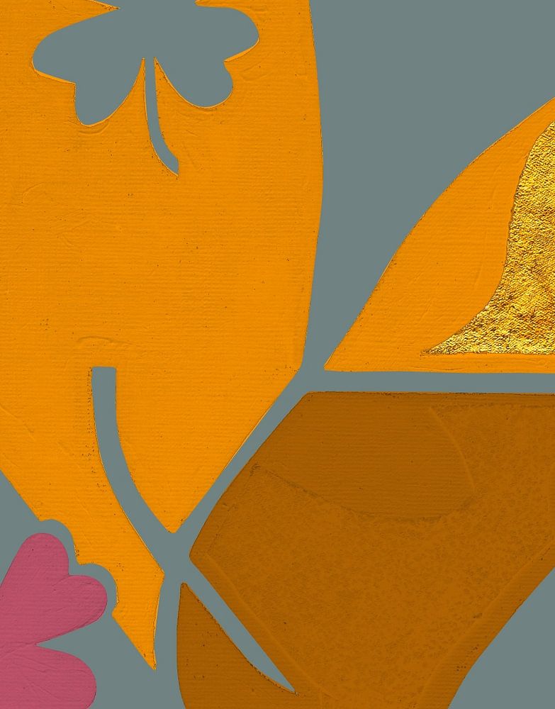 Lucky Heart, orange is a graphic. Painted with acrylic paint on canvas. The use of leather painted with gold colour gives depth to this painting.