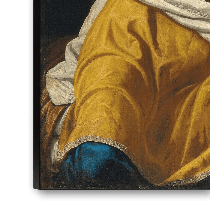 The depiction of Lucretia displays a splendour of flesh-tones, with white, yellow-gold and deep blue drapery and the figure´s vigorous form dynamically moves to the right edge of the pictorial space.