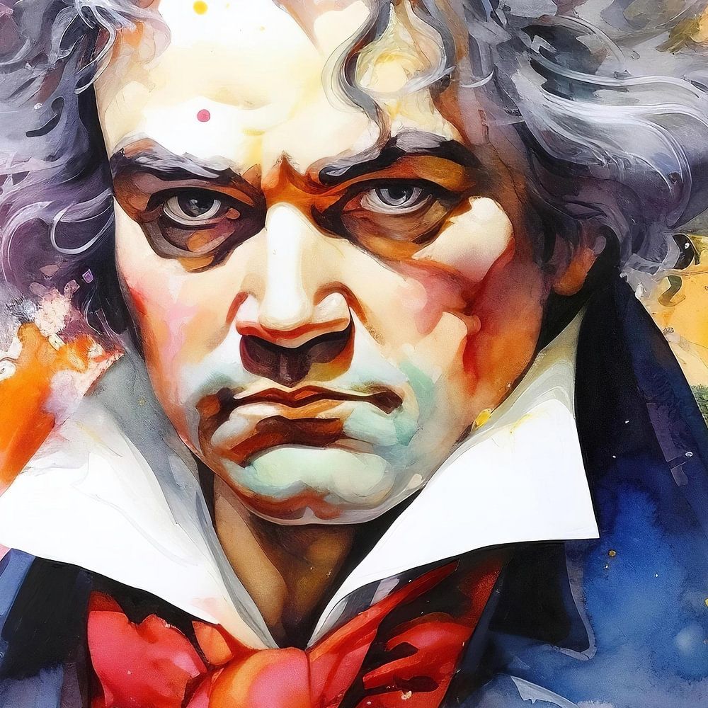 Portrait of the famous composer in the style of a watercolour illustration.